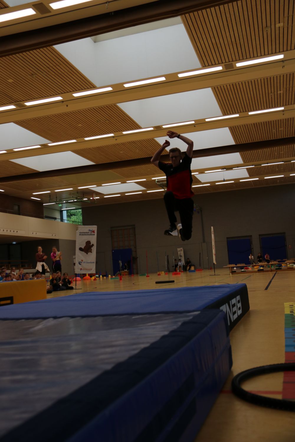 Am 06.06. ging es dann für das Projektteam des WLV auch schon an die nächste Schule. Dieses Mal in Heimsheim. Trotz des regnerischen Wetters waren alle Kinder eifrig dabei und wollten unbedingt alle acht Stationen einmal ausprobieren. Dank der Spontanität aller Helfer:innen konnte die Veranstaltung teilweise in der Halle und teilweise draußen auf dem Tartanplatz durchgeführt werden und der Wunsch der Kinder, alle Stationen durchführen zu dürfen, wurde erfüllt. Auch hier durfte die Vorführung des Topathleten nicht fehlen. Alle Kinder freuten sich auf Lias Schuster des LV Biet und beobachteten genau wie er von Sprung zu Sprung weiter flog.